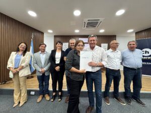 El intendente Rubén Rach encabezó una nueva entrega de títulos de propiedad a vecinos de la ciudad, junto al presidente del Concejo Alejandro Barcala, la secretaria de Gobierno Gisela Doffi y el asesor legal del Municipio Rafael Ávila.
